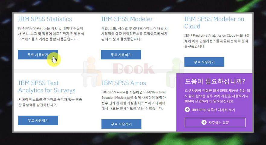 기본이 되는 IBM SPSS Statistics 체험판을 비롯하여 Modeler, on Cloud, Text Analytics, Amos 등 다양한 프로그램이 준비되어 있답니다. 무료 사용하기 버튼으로 원하는 버전을 다운로드 받으실 수 있어요.