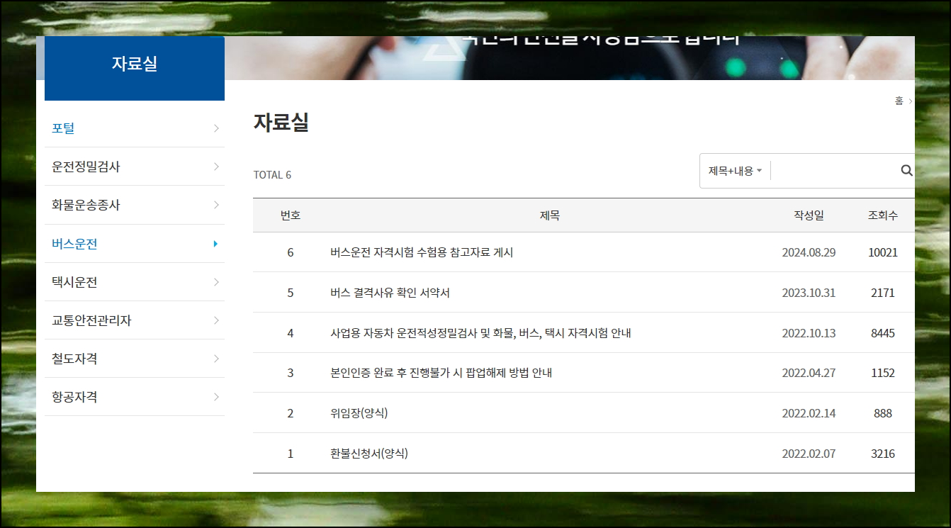 자료실에서 다양한 운전 관련 메뉴를 확인할 수 있습니다. 버스운전 자격시험 항목을 선택하면 수험용자료를 포함한 여러 가지 도움이 되는 자료를 찾을 수 있으니 편리해요.
