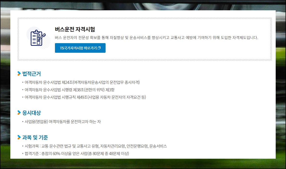 버스운전 자격시험에 관련된 안내사항이 상세하게 나와있으니 꼭 확인하세요. 시험 준비에 도움되는 정보들이 많이 있습니다. 화면 상단에 있는 "바로가기" 버튼을 선택하면 수험용자료를 포함한 더 자세한 내용을 볼 수 있어요.