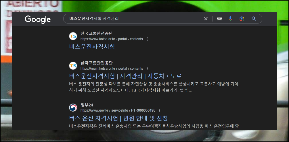 한국교통안전공단 사이트에서 버스운전 자격시험 정보와 자료를 얻을 수 있습니다. 검색창에 lic kotsa bus를 입력하고 세 번째 링크를 선택하시면 됩니다. 기출문제집도 여기서 확인 가능해요.