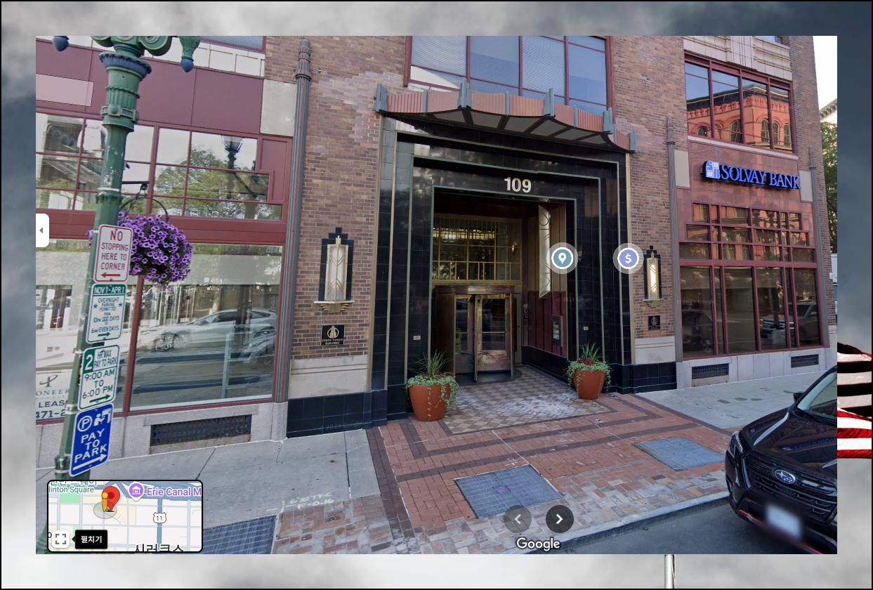 지도를 계속 확대하면 건물 이름까지 상세하게 볼 수 있어요. 미국 전역의 거리를 크게 보기 위해 우측에 있는 사진들 중에서 특히 회전 표시가 된 것을 클릭해보세요. 실제 거리 모습과 건물의 외관을 생생하게 볼 수 있습니다. 도로명과 번지수도 정확하게 표시되어 있어 길 찾기가 훨씬 수월해요.