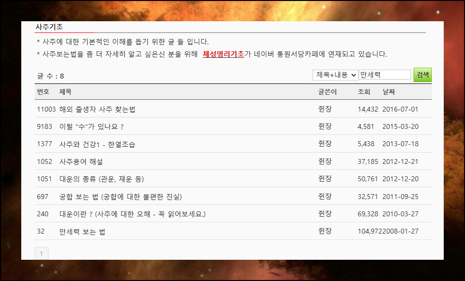 이곳에서 풀이 결과를 보기 이전에 기본적인 지식이 필요해요. 이곳에 학습자료가 충분히 마련되어 있으니 스스로 공부하면서 이해도를 높여보시길 바랍니다. 이곳 외에도 온라인 상에서는 해석법에 관련하여 자료가 풍부합니다. 이번 시간에는 이곳에 있는 것만 보도록 하죠. 검색을 통해 "만세력"에 직접적으로 관련된 자료만 찾아보실 수 있어요.
