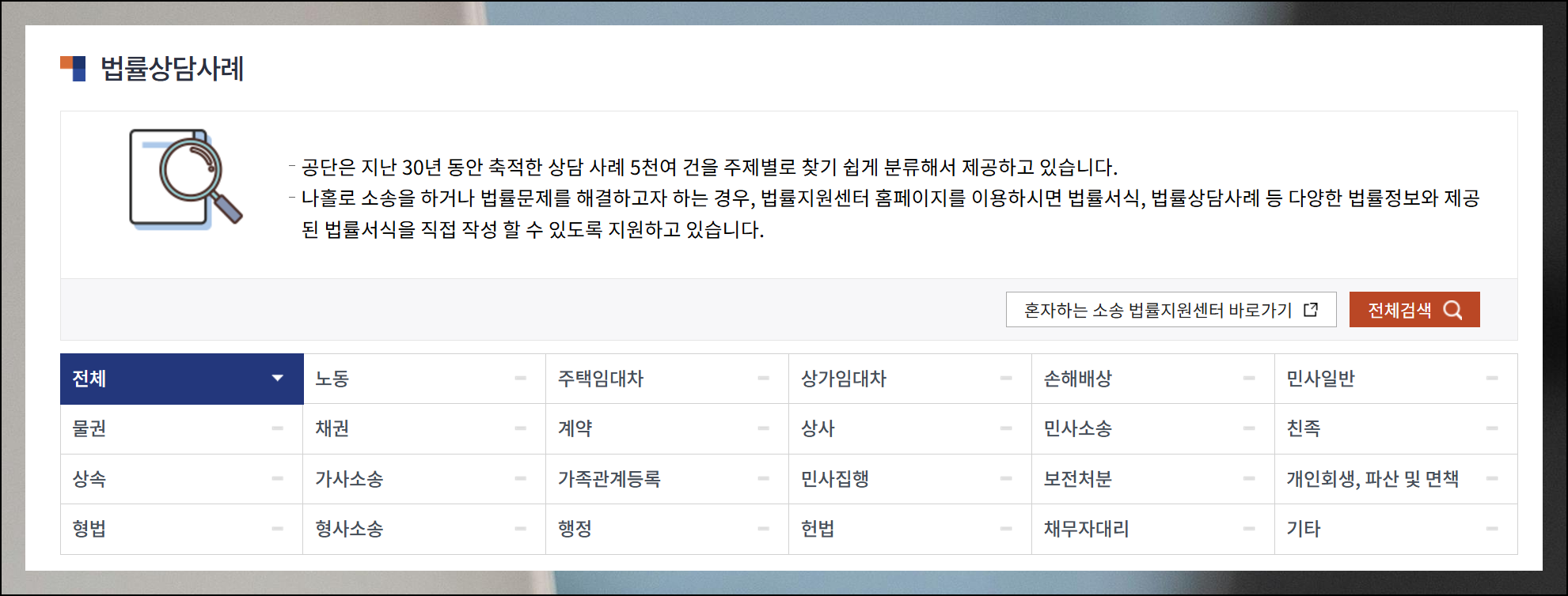 대구 센터의 상담 가능한 분야는 매우 다양합니다. 노동, 주택, 상가, 손해배상, 민사 소송 등 30년간 축적된 풍부한 사례들이 분류별로 정리되어 있어요.