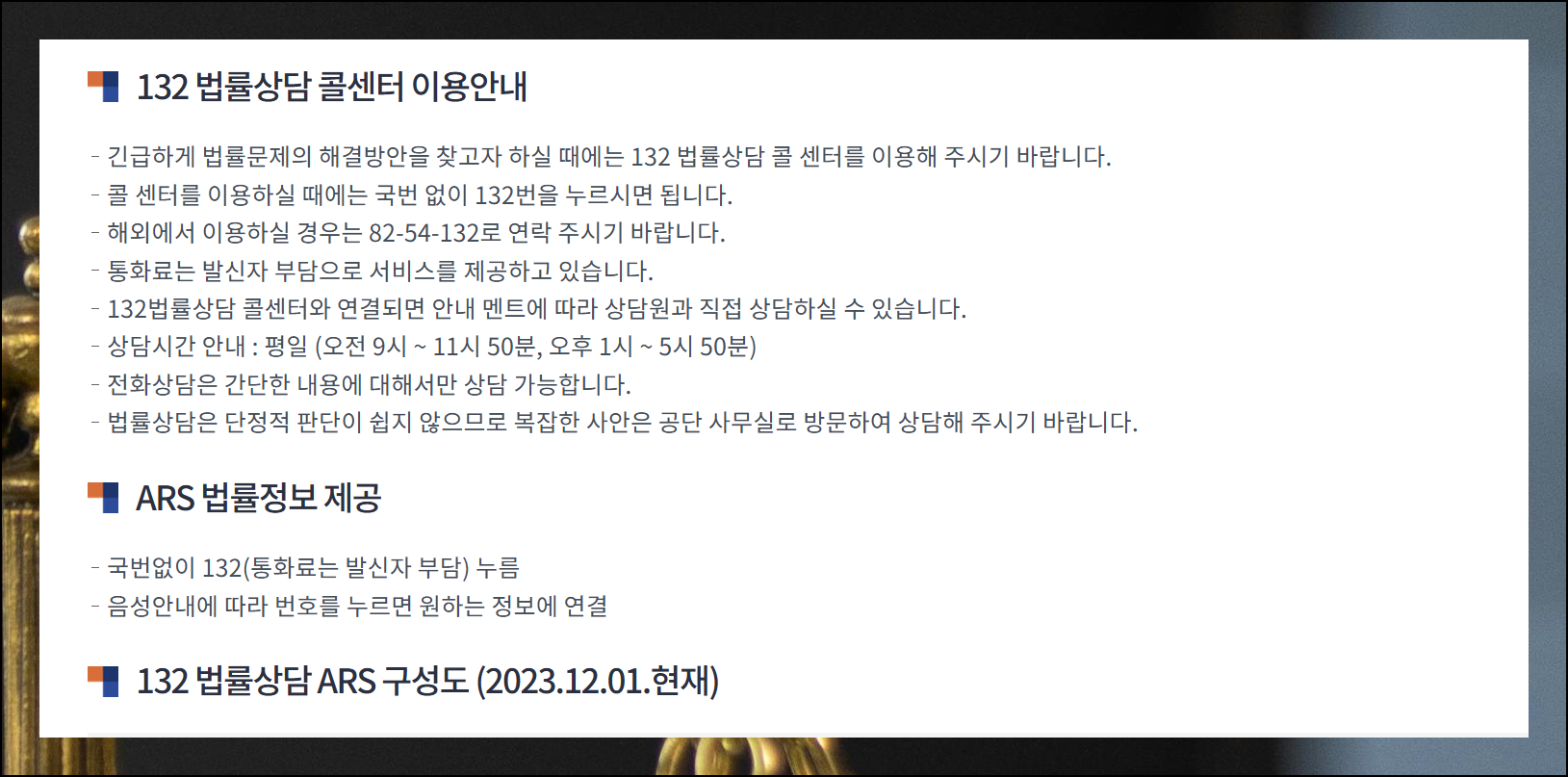 무료 법률상담을 위해 132 번호로 연락하시면 됩니다. 해외에서는 국가 코드와 지역 코드를 추가로 입력하셔야 해요. 통화료만 부과되며, 복잡한 사안은 직접 방문이 필요할 수 있습니다.