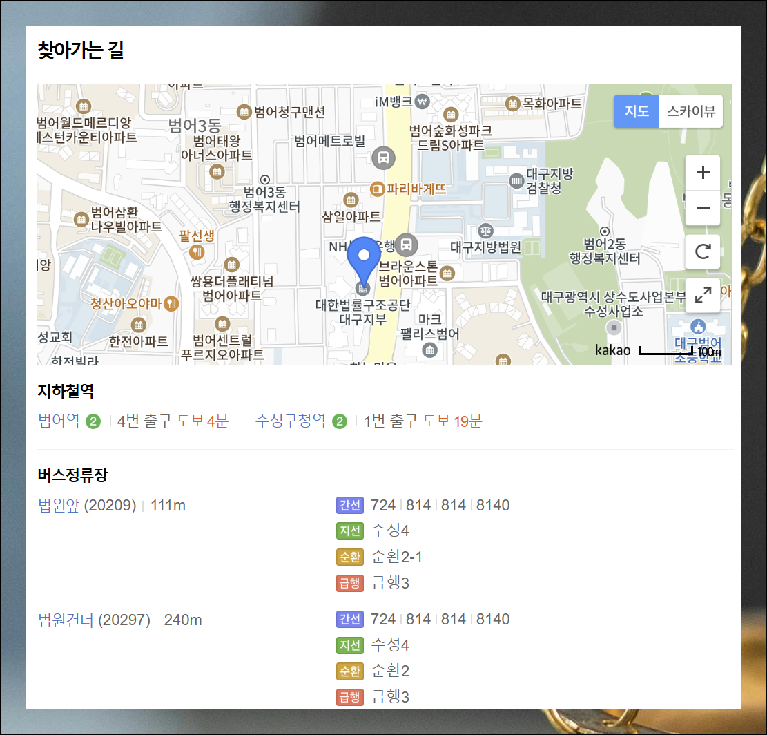 대구 센터 주변에는 두 개의 정류장이 있습니다. 법원 앞 정류장은 도보 111미터, 법원 건너편 정류장은 240미터 거리에 위치해 있어요. 대중교통을 이용하시는 분들은 이 두 정류장을 참고하시면 됩니다.