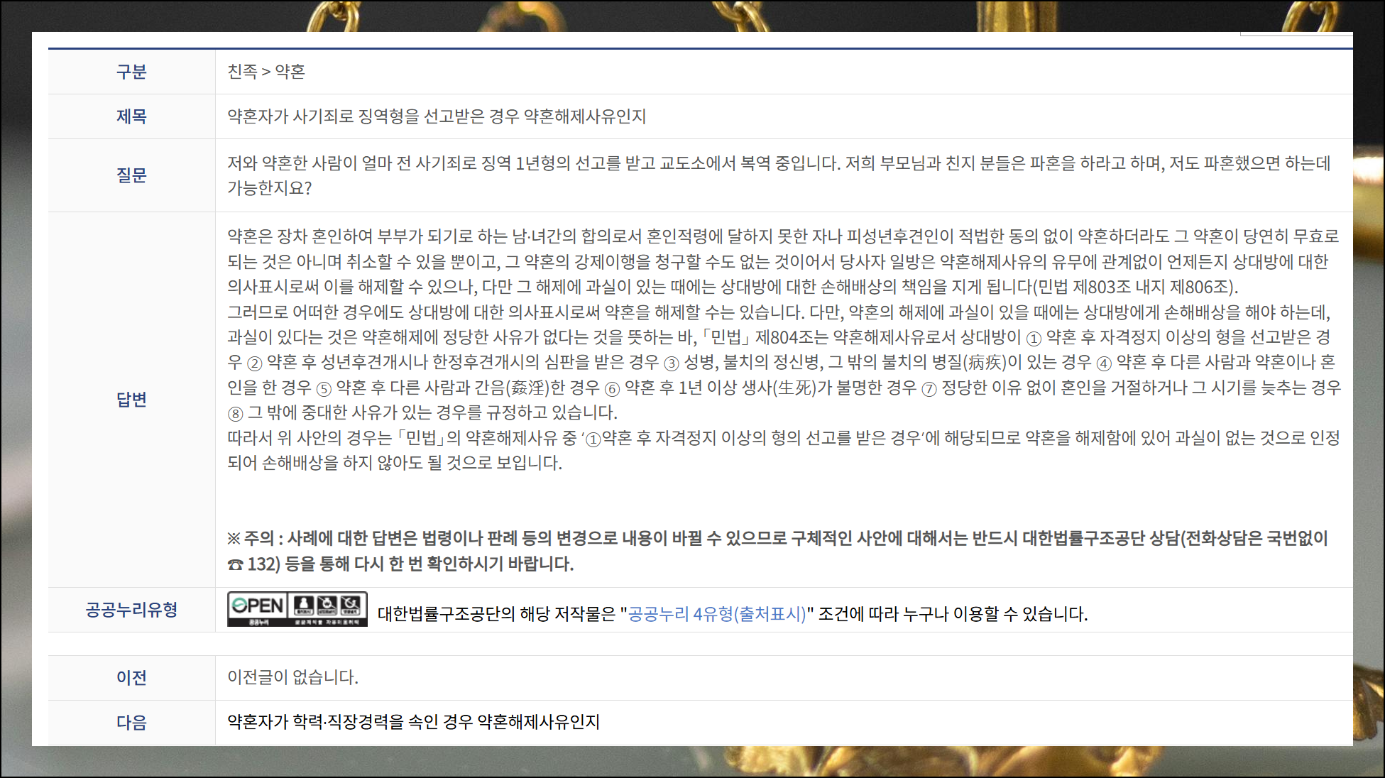무료 법률상담센터에서는 구체적인 질문과 답변 사례들을 쉽게 찾아볼 수 있습니다. 본인의 상황과 유사한 사례를 찾아보면 도움이 될 수 있어요. 적절한 사례를 찾지 못했다면 직접 상담을 신청하시면 됩니다.