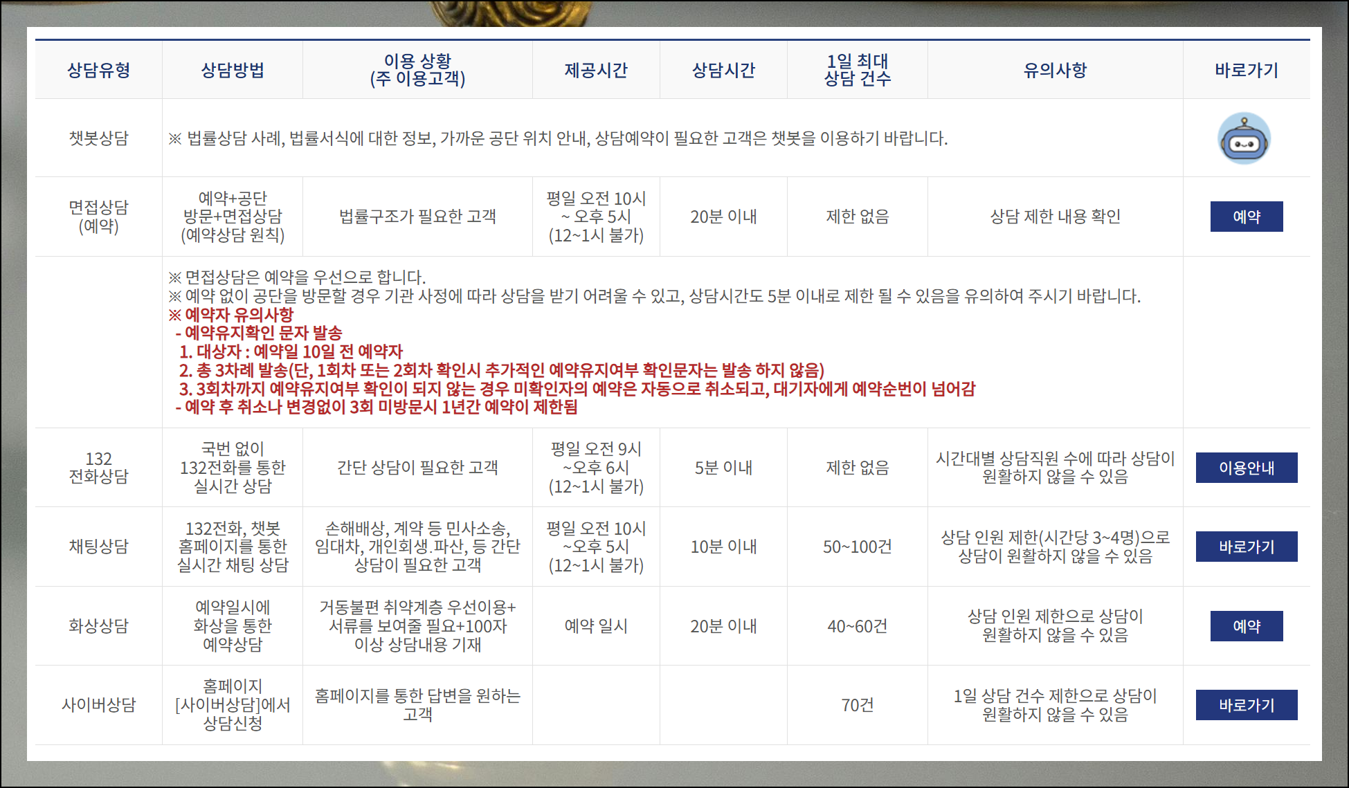 방문 상담뿐만 아니라 온라인이나 화상 상담도 가능합니다. 특히 긴급한 문제를 겪고 계신 분들을 위해 통화 서비스도 운영하고 있어요.