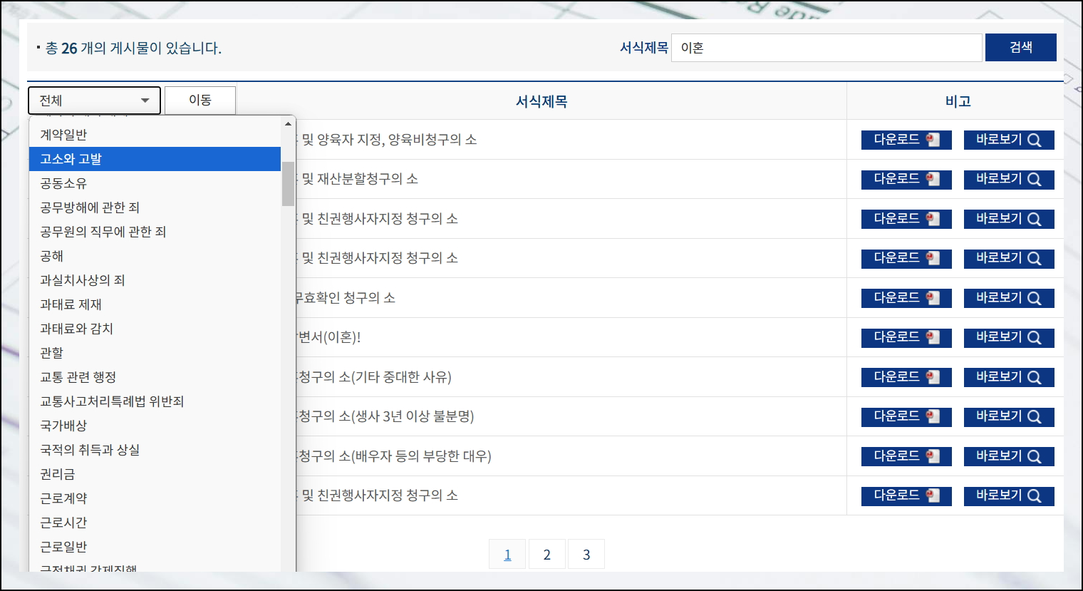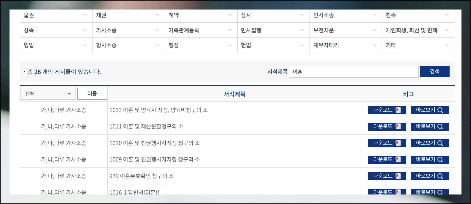 이혼 관련 자료는 무려 26종이나 준비되어 있습니다. 검색창에 필요한 항목을 입력하면 관련 내용을 한눈에 찾아볼 수 있어요. 가정법원 제출용 서류들이 체계적으로 분류되어 있습니다.