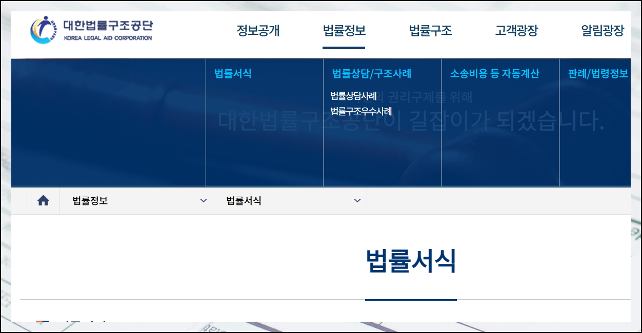 법률서식 메뉴를 통해 법률지원센터로 이동하면 됩니다. 이용자 편의를 고려한 간단한 경로로 구성되어 있어요. 이혼 관련 정보를 쉽게 찾을 수 있도록 구성되어 있습니다.