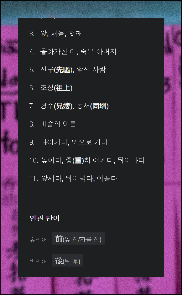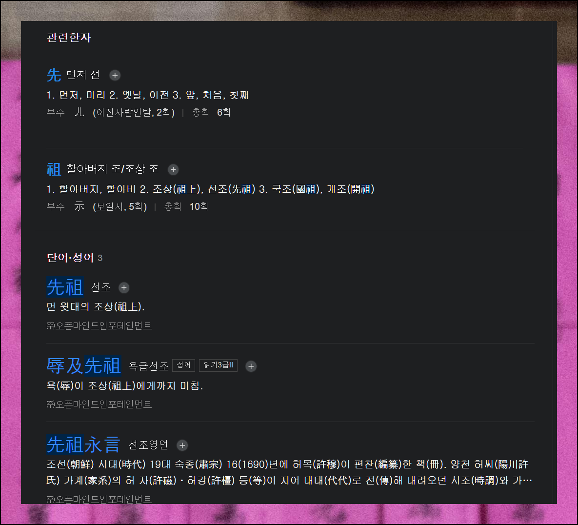 예시로 선조라는 단어를 검색해봤어요. 각각의 한자가 가진 의미는 물론, 단어에 대한 자세한 설명까지 한눈에 볼 수 있습니다. 한글로 된 상세한 설명을 통해 이해하기 쉽게 정리되어 있어요.