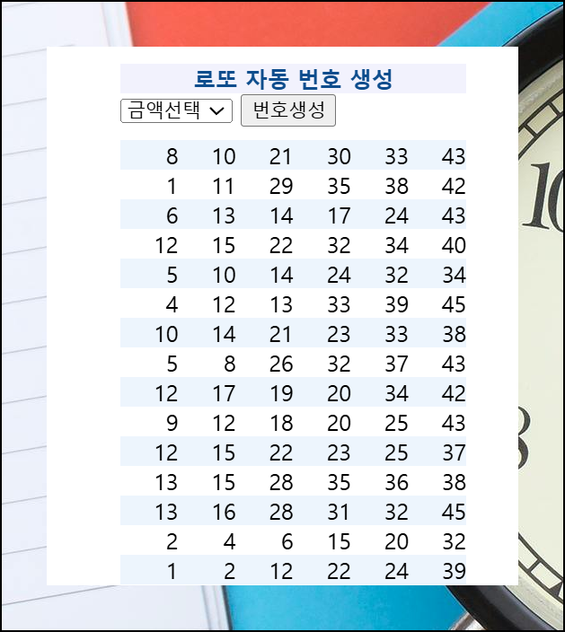 로또 복권을 30,000원어치 구매할 계획이라면 목록에서 해당 금액을 선택해주세요. 다음 자동 생성 버튼을 누르면 됩니다. 그럼 곧바로 30개의 번호 조합이 나타날 거예요.