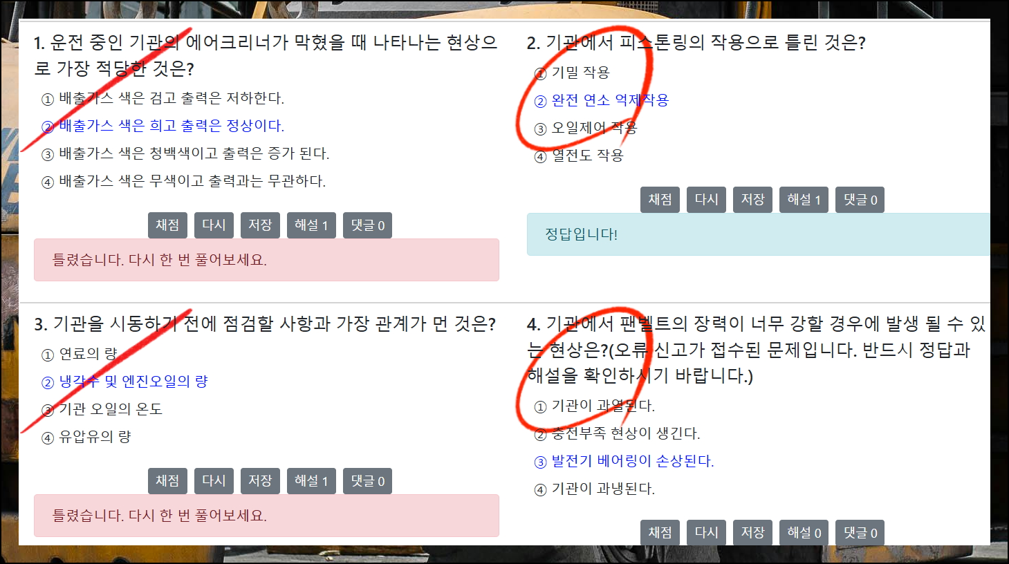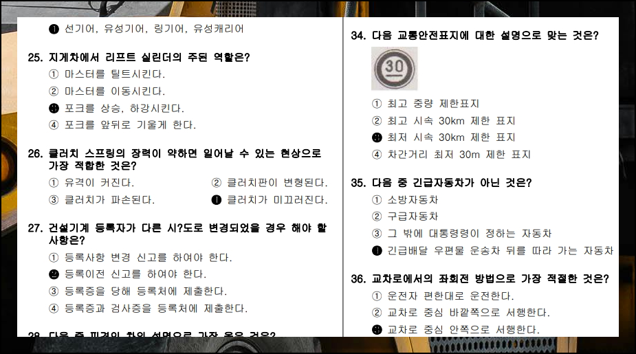 전문가가 되기 위한 첫걸음은 실전 연습입니다. 지게차운전기능사 필기시험의 다양한 주제를 온라인으로 풀어보았어요. 특히 엔진과 관련된 문제들이 많이 출제되더군요. 초보자의 입장에서도 채점과 해설을 통해 차근차근 학습할 수 있었습니다.