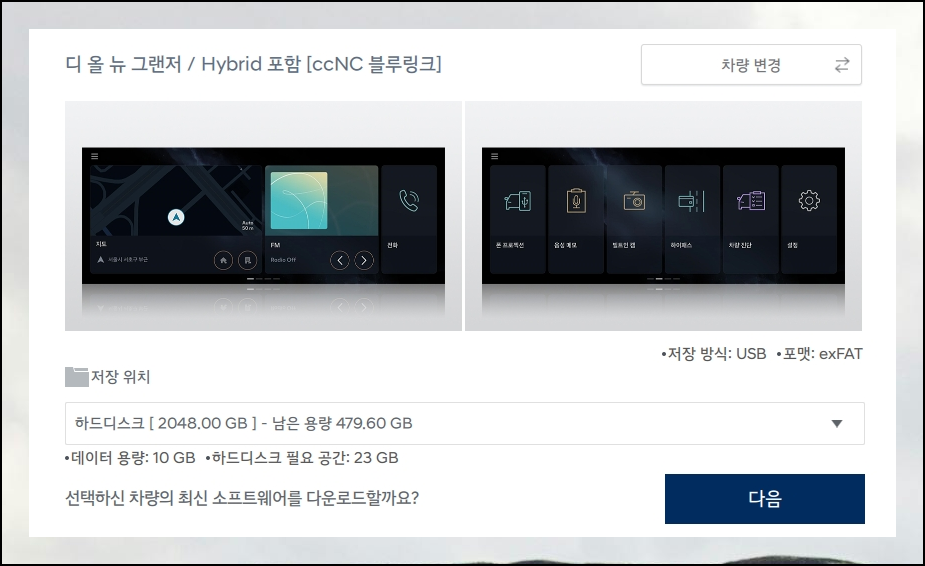 업그레이드 방법은 매우 쉬워요. 차량 정보나 소프트웨어 버전으로 내 차량을 찾아 선택하고, 저장 위치를 지정하면 준비 끝입니다.