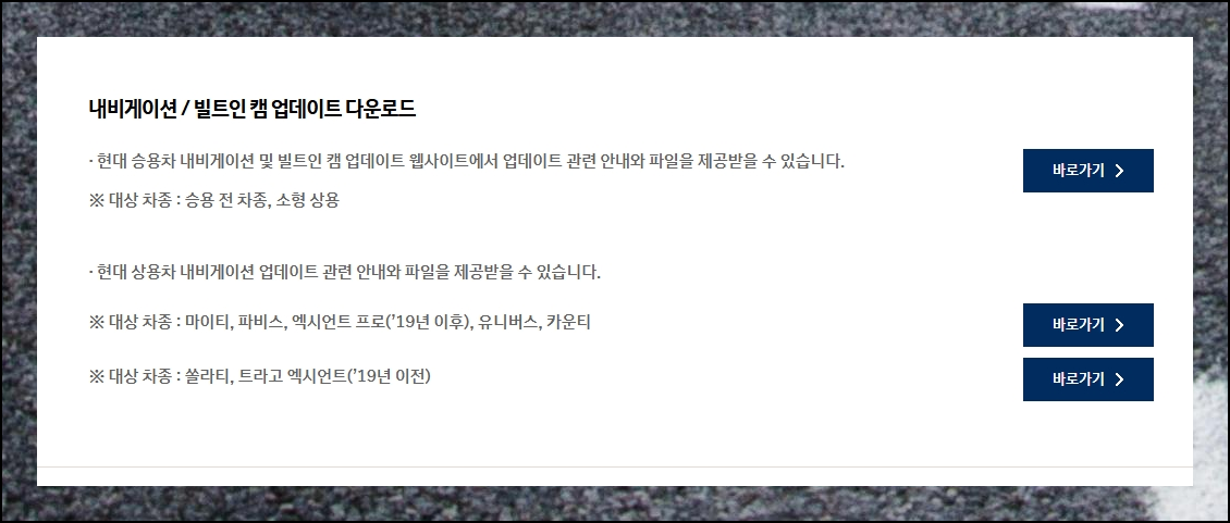 현대자동차 웹사이트의 좌측 메뉴에서 내비게이션 업데이트를 찾아보세요. 시승신청이나 카탈로그 등 여러 메뉴 사이에서 쉽게 발견할 수 있어요.