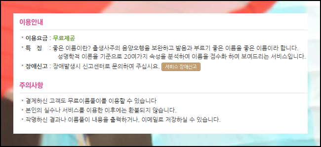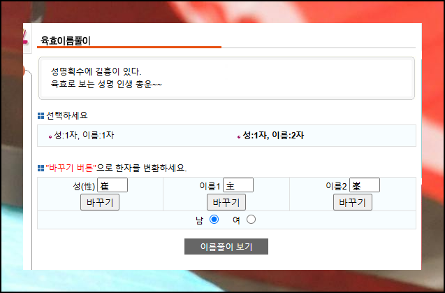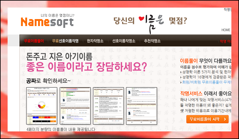 사이트에 접속하면 한글 및 한자 이름풀이, 작명 등 여러 서비스를 제공하는 메뉴가 있어요. 첫 화면에서 무료로 제공되는 이름풀이 서비스를 쉽게 찾을 수 있답니다.