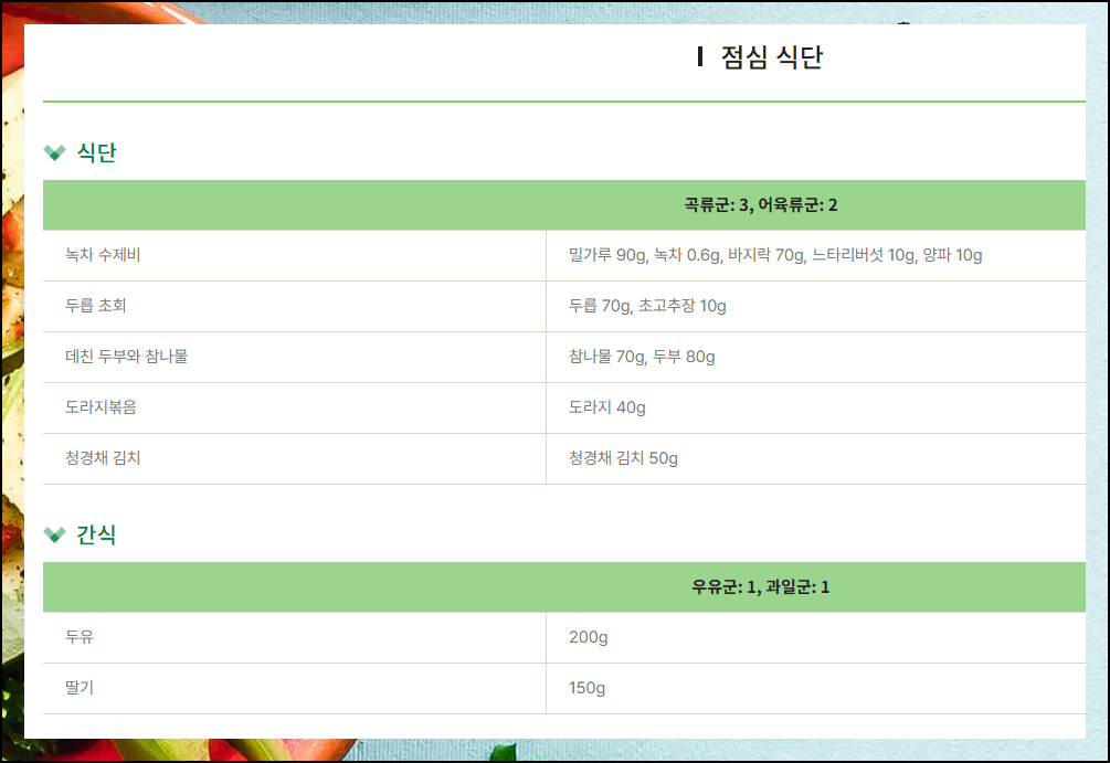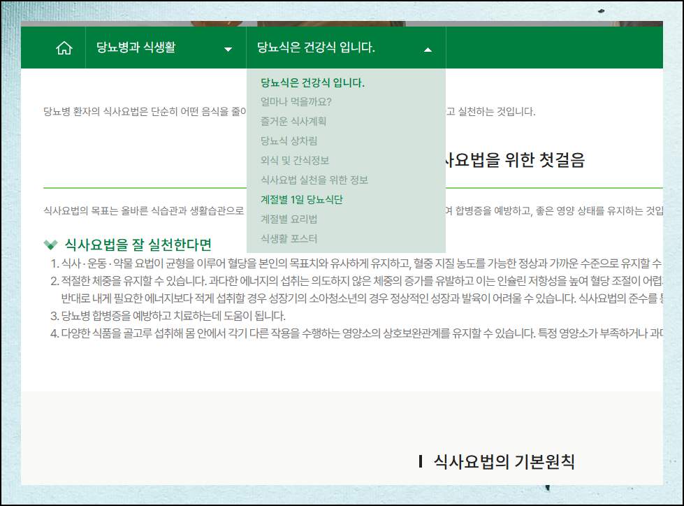 기본원칙을 이해하고 실천하는 것이 무엇보다 중요해요. 당뇨 식사는 건강식이라는 걸 기억하면서 계절별 구성을 확인해보세요. 1주일 분량의 건강한 식단표를 만들기 위해서는 이러한 기본 지식이 꼭 필요합니다.