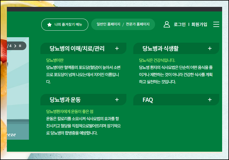 "당뇨병과 식생활" 메뉴에서 건강한 식사를 위한 정보를 찾아보세요. 1주일 식단표 구성에 도움이 되는 다양한 정보들이 있습니다. 운동과 관리는 이후에 천천히 알아가도 좋아요.