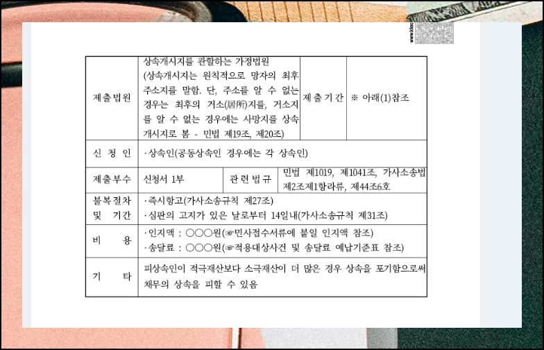 다운 받은 hwp 파일을 열어보세요. 그럼 마지막 페이지에 이렇게 제출법원, 신청인, 제출부수, 불복절차 및 기간, 비용 등과 같이 상속재산 분할협의서 제출에 관련된 안내 사항을 살펴볼 수 있습니다. 이러한 것을 잘 숙지해서 원활하게 진행이 될 수 있도록 하는 것이 좋아요.
