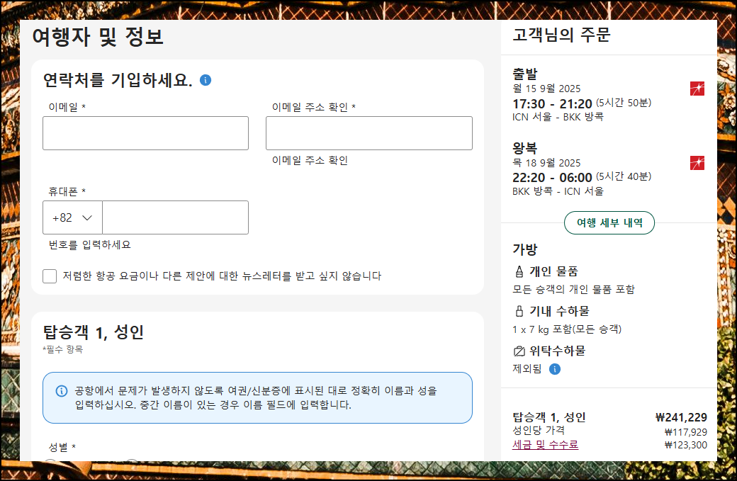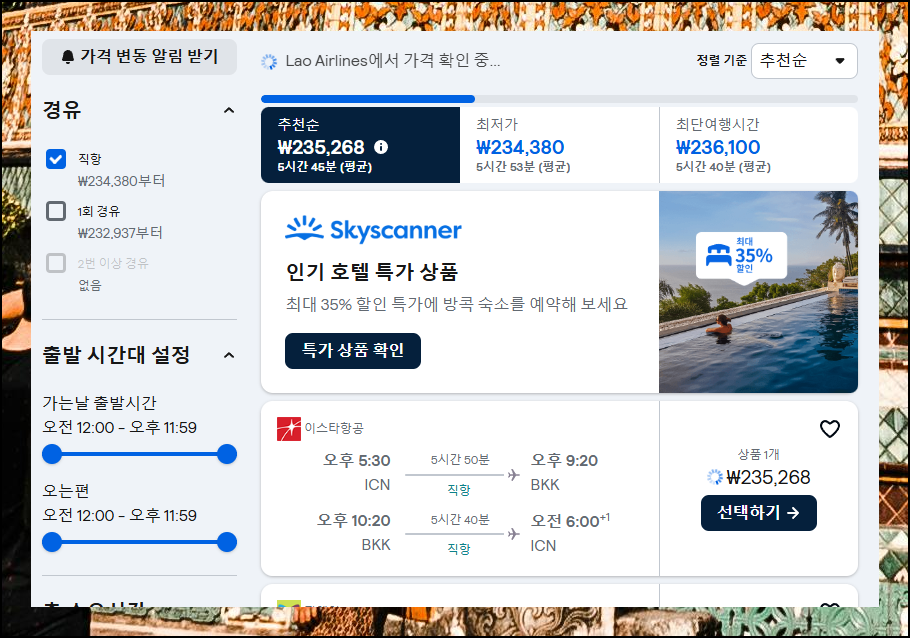 할인 항공권을 기다리고 계신다면 요금 변동 알림 기능을 활용해보세요. 해당 메뉴에서 알림 설정만 해두시면 더 저렴한 티켓을 예매하실 수 있는 찬스를 놓치지 않을 수 있답니다. 비행기로 태국까지 가는 여정이 꽤 긴 편이니, 쾌적한 여행을 위해 세심한 계획이 필요해요.