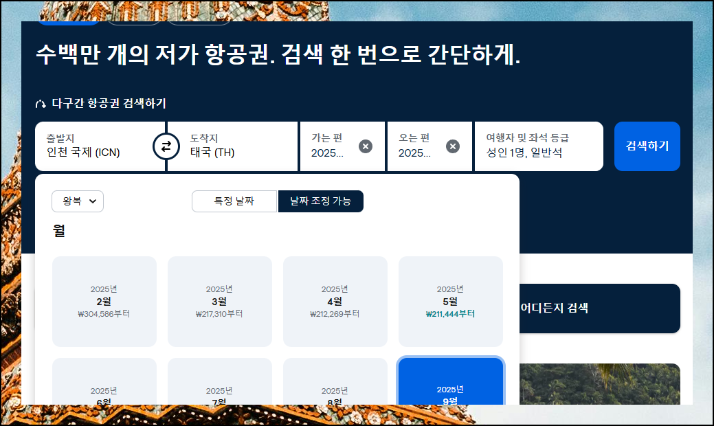 비행기 티켓을 합리적으로 구매하는 꿀팁을 알려드릴게요. 일단 도착지를 "태국"으로 지정하고, 가는 편과 오는 편의 경우에는 "날짜 조정 가능"을 선택합니다. 그 다음 "가장 저렴한 달"이라고 표시된 날짜를 선택해 주세요. 이렇게 하면 최저가 티켓을 구하는 데에 큰 도움이 됩니다. 나머지 조건도 모두 입력했다면 [검색하기] 버튼을 눌러주세요.