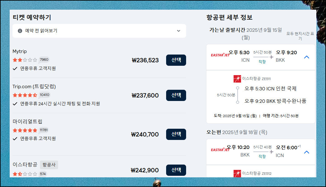 실제로 예매할 수 있는 태국행 항공권에 대한 정보를 살펴볼게요. 보시는 바와 같이 비행시간은 5시간 40분에서 50분 사이로 예상이 됩니다. 이렇게 태국에 갈 때 실제로 얼마의 시간이 걸리는지 확인이 가능해요. 항공권 리스트에서 마음에 드는 조건이 있으면 [선택하기]를 클릭해 보세요. 그럼 바로 예매 진행도 가능합니다.