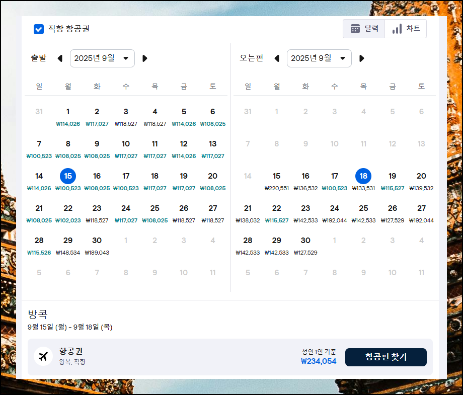 이렇게 도시에 따라 항공권 요금을 비교한 후, 가격적으로나 개인적으로 마음에 드는 도시의 공항을 선택하면 됩니다. 날짜의 경우에도 티켓 금액이 써있는 달력에서 가격과 만족도가 높을 것으로 예상되는 날짜를 선택하면 됩니다.