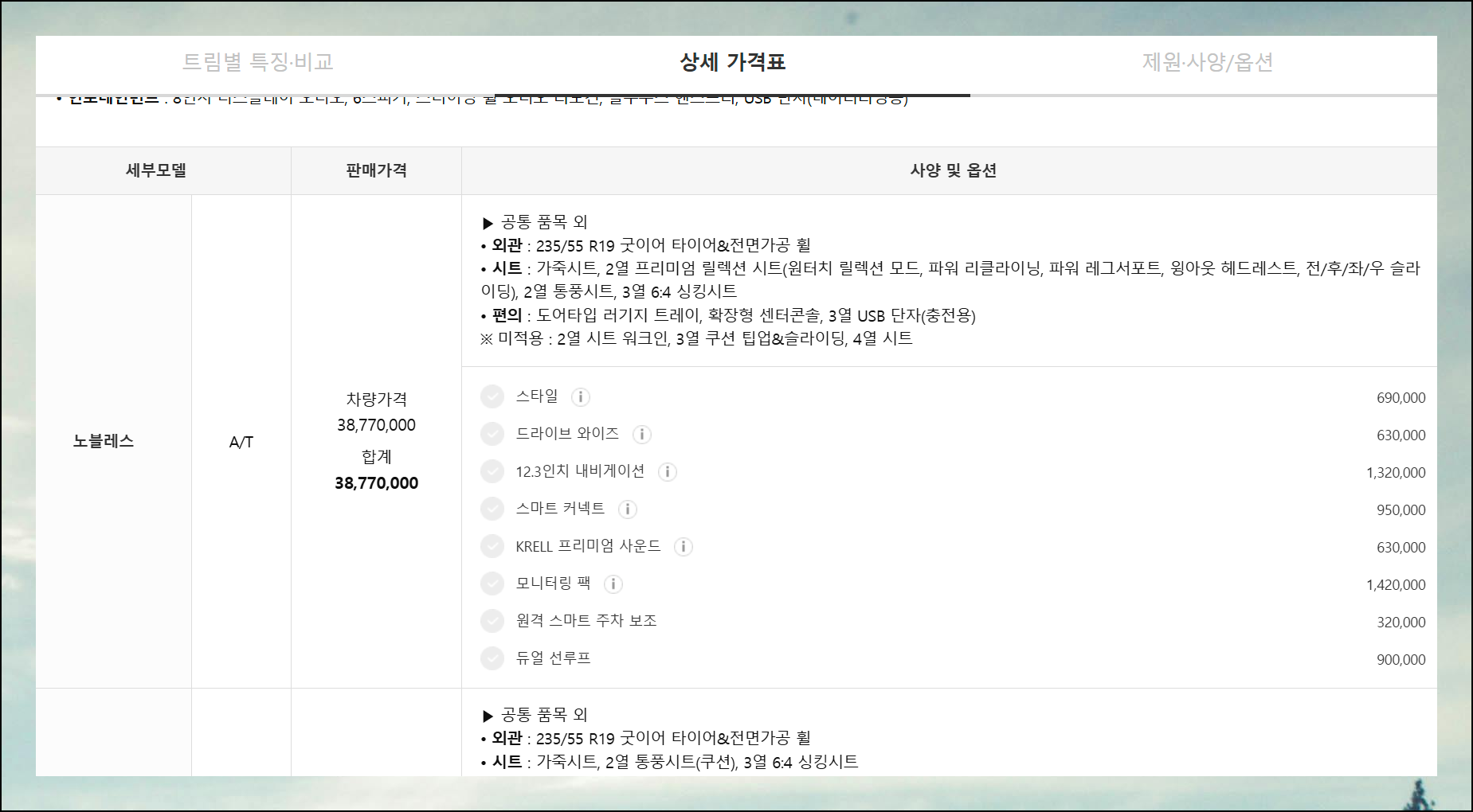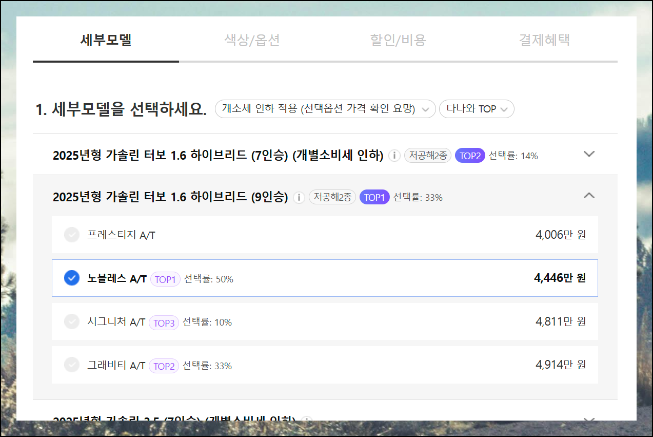 세부모델 선정 시 상세 스펙과 인기 순위(TOP 표시)를 참고하면 유용해요. 차량 가격은 트림별로 약 400~500만원의 차이가 있으니 예산에 맞게 고르세요. 가격표를 통해 한눈에 비교할 수 있습니다.