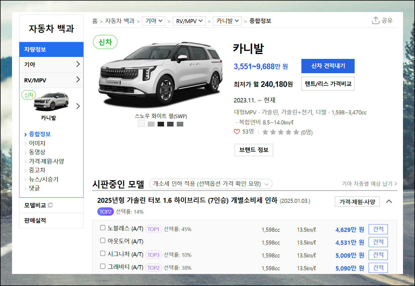 다나와 자동차 홈페이지에서 회원등록 없이도 카니발 9인승 차량의 정확한 견적 정보를 즉시 확인 가능해요. 다양한 차종별 가격표도 제공됩니다.