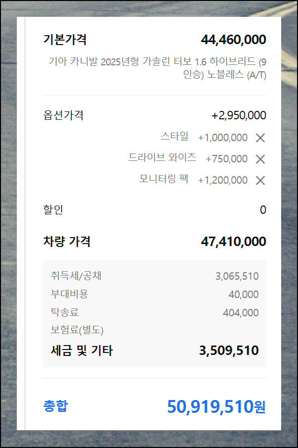 취득세, 공채비용, 탁송비 등의 추가 경비도 면세조건과 지역 정보 입력 시 자동 산출됩니다. 모든 선택을 완료하면 우측 전체 가격표에서 카니발 9인승의 최종 구매 금액을 확인 가능해요. 이 서비스로 나에게 적합한 구매 계획을 세워보세요.