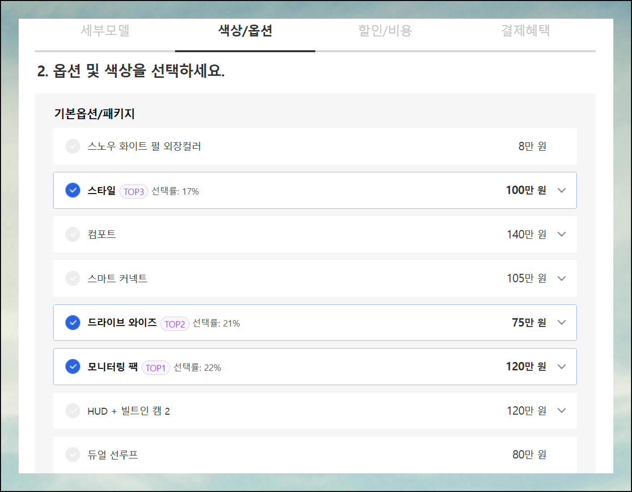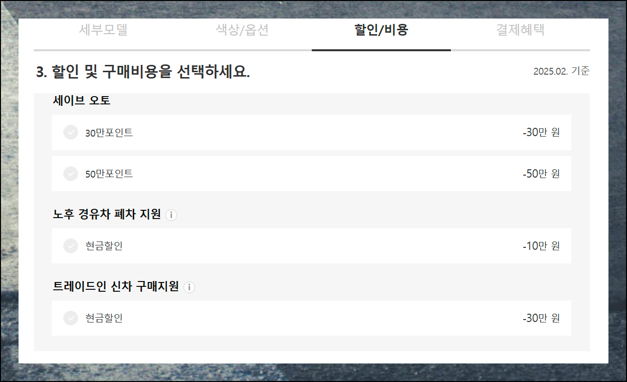 2025년 2월 판매조건에 따른 할인 항목 중 이용 가능한 것을 선택하면 최종 금액을 절감할 수 있어요. 신차를 더 경제적으로 구매할 수 있는 기회입니다. 정확한 가격표 확인은 필수예요.