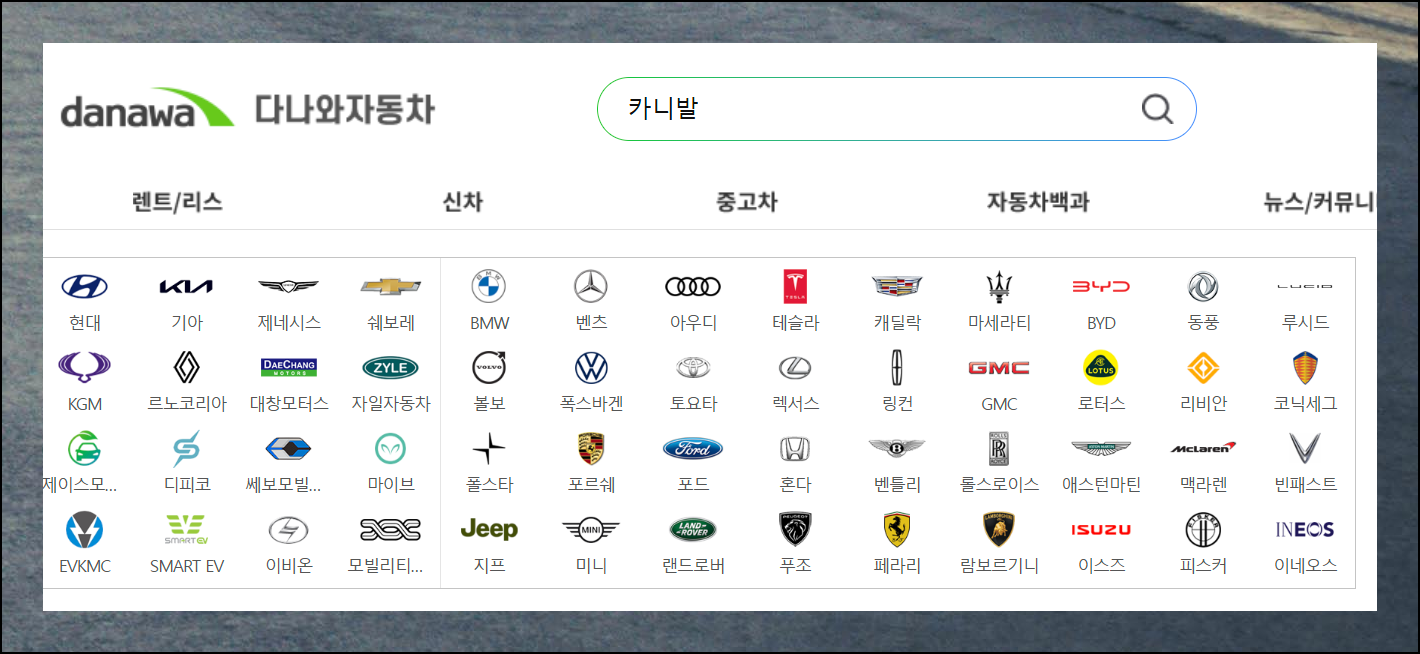 웹페이지 접속 후 상단 중앙 검색창에 "카니발"을 입력하고 엔터키만 누르면 필요한 자료를 신속하게 찾을 수 있습니다. 여러 차량 정보를 간편하게 탐색해보세요.