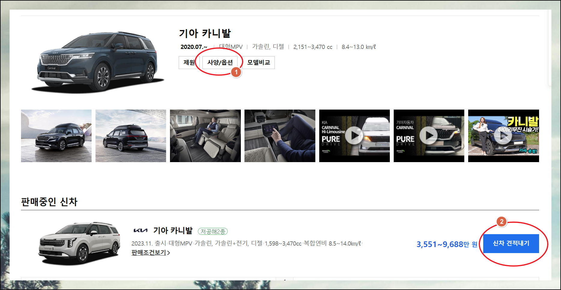 검색 결과 화면에서는 기아 신형 카니발의 사진, 영상, 제원, 특징 등 모든 내용을 확인할 수 있어요. 가격표를 살펴보기 전 [사양 / 옵션] 버튼을 눌러 차량에 대해 자세히 알아보세요.