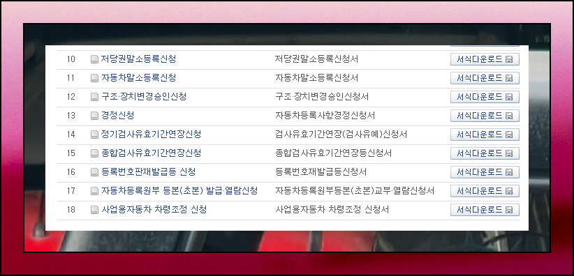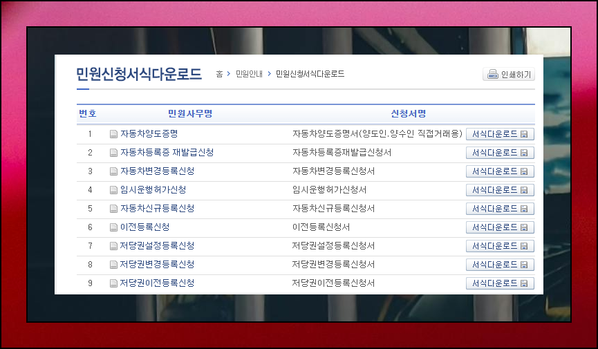 자동차민원 대국민 포털은 다양한 서비스를 제공합니다. 메인 메뉴에서 '민원 신청서식 다운로드'를 선택하면 우리에게 필요한 양식 문서를 찾을 수 있어요. 사이트 이용이 어렵지 않아 누구나 쉽게 이용할 수 있습니다.