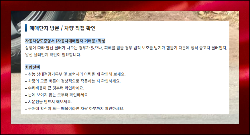 딜러의 유형을 먼저 확인하고, 자동차의 상태와 성능을 직접 점검하세요. 차량 매매시 눈에 잘 띄지 않는 부분까지 꼼꼼히 살펴보는 것이 중요합니다. 시운전을 통해 주행감과 소음도 체크해 보세요. 이런 절차는 추후 문제를 예방하는 데 큰 도움이 됩니다.