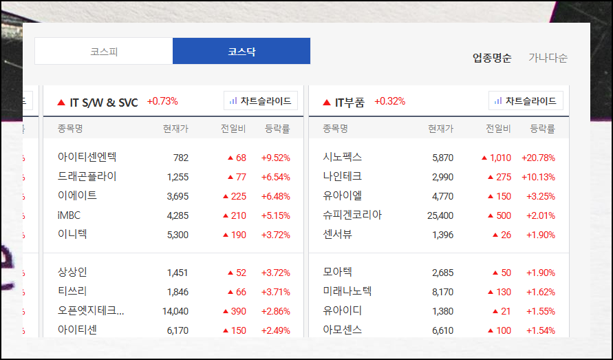 이 서비스는 코스피와 코스닥에 상장된 모든 종목의 현재가, 전일비, 등락률 등을 직관적인 색상 구분과 함께 보여줍니다. 특히 업종별 정렬 기능과 자동 슬라이드 차트는 관심 분야의 종목들을 효율적으로 모니터링하는 데 큰 도움이 돼요.