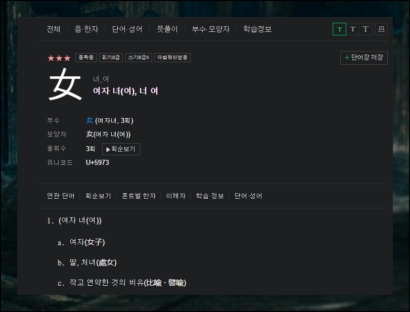 한자를 선택하면 부수, 총획수, 유니코드, 모양자, 난이도 등 다양한 내용을 한 눈에 볼 수 있어요. "여자 녀(女)"를 네이버 옥편에서 검색하면 여러 의미와 용례까지 파악할 수 있습니다.