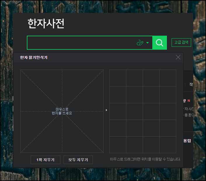 필기인식기 창에서 마우스로 알아보고 싶은 한자 모양을 그려보세요. 실제 그림 솜씨는 중요하지 않아요. 그리면 시스템이 비슷한 문자 20개를 추천해주니까요. 찾고자 한 문자를 선택하면 검색창에 자동 입력되고, 관련 단어나 고사성어도 자동완성 기능으로 확인할 수 있습니다.
