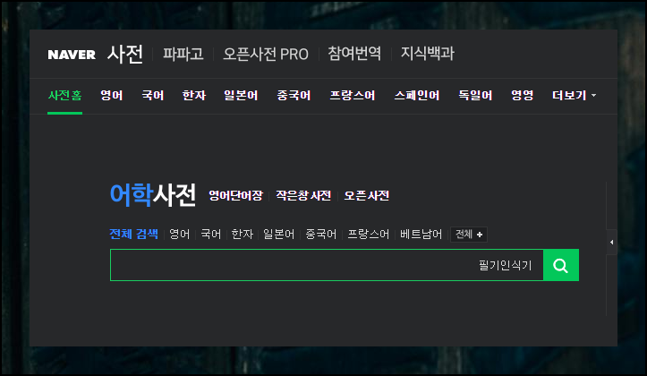 네이버 어학사전에 접속하면 영어, 국어, 일본어, 중국어 등 여러 언어 참고서가 준비되어 있습니다. 이중에서 '한자'를 클릭하면 바로 옥편 서비스 화면으로 연결됩니다.