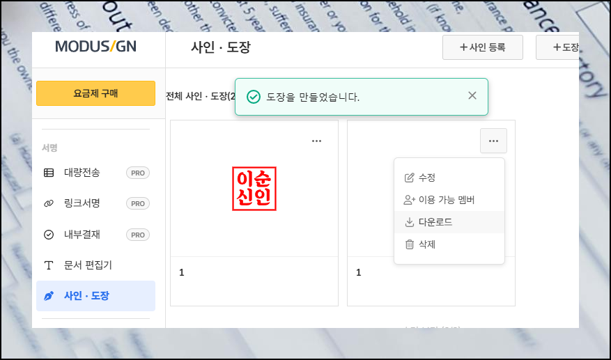 결과물 옆에 메뉴 버튼을 누르면 '다운로드' 버튼이 나타납니다. 이 버튼을 클릭하면 전자도장 이미지가 컴퓨터에 저장돼요. 필요할 때마다 문서에 삽입하여 활용할 수 있어 매우 편리합니다.