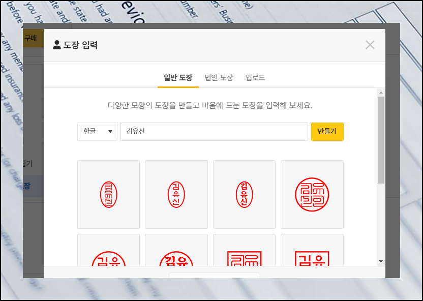 일반용과 법인용 모두 만들 수 있어요. 한글 또는 한자로 이름을 입력하고 '만들기' 버튼만 누르면 전자도장 완성입니다. 프로그램에서 자동으로 만든 여러 디자인 중에서 마음에 드는 것을 선택하기만 하면 돼요.
