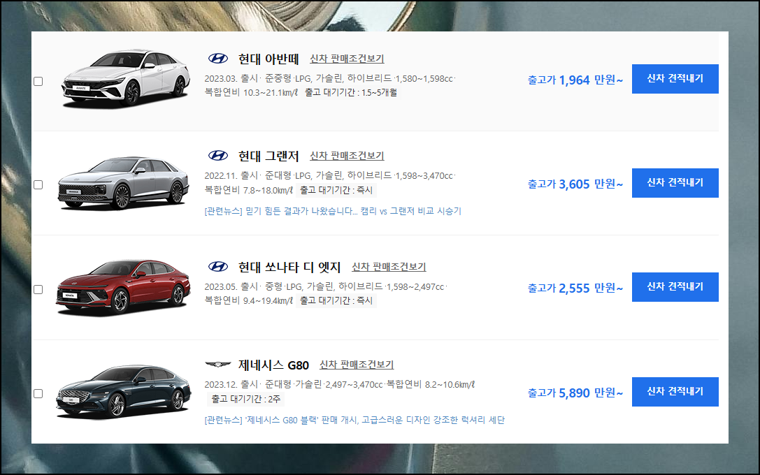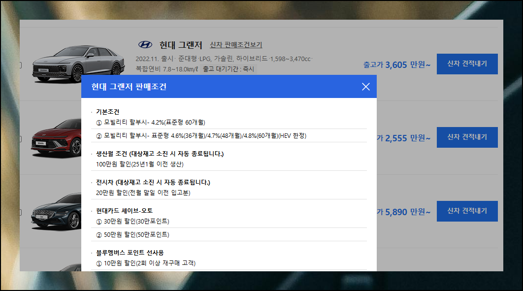 검색 결과 그랜져는 두 번째로 인기 있는 모델로 나타났는데요. 가격표 출고가가 1,964만원부터 시작이 된다고 표시되어 있습니다. 동일한 차량이라도 등급과 옵션에 따라 최종 금액이 달라지기 때문이에요. 정확한 현대자동차 신차가격을 파악하려면 원하는 사양을 미리 알아두세요.
