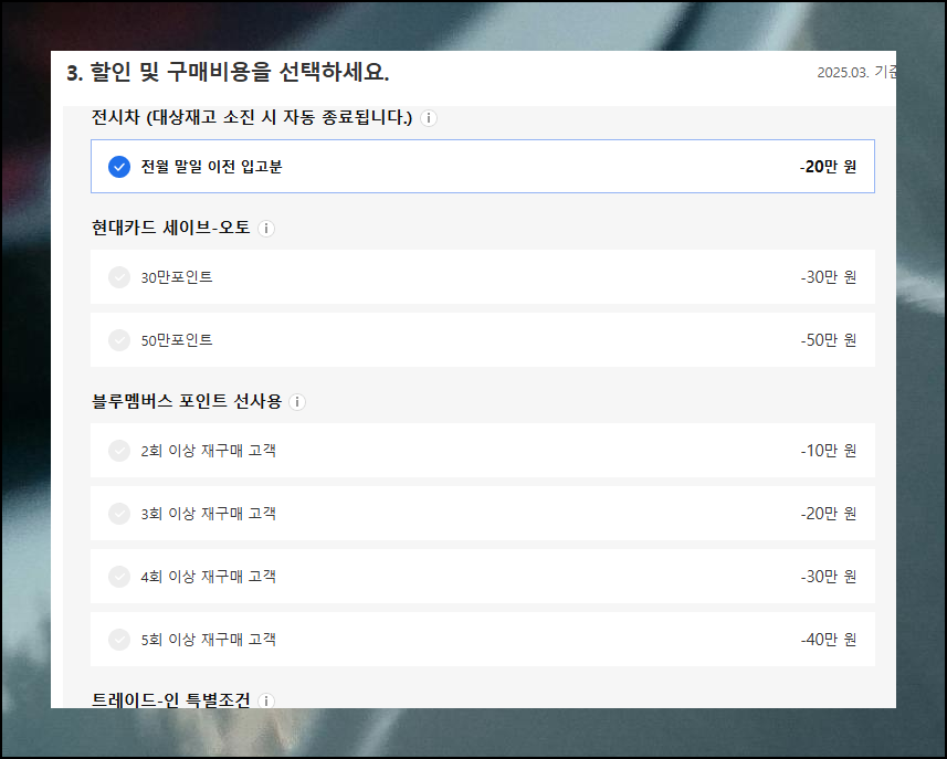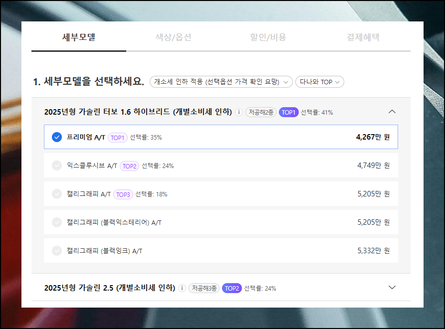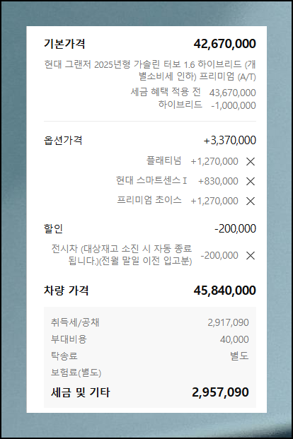 세부모델과 옵션 선택 후 받을 수 있는 할인 혜택도 선택해 최대한 경제적으로 구매하세요. 차량 비용 외에도 취득세, 공채, 탁송료 같은 추가 지출이 발생하니 모두 포함해 신차 구매 총액을 미리 파악하는 것이 중요합니다.