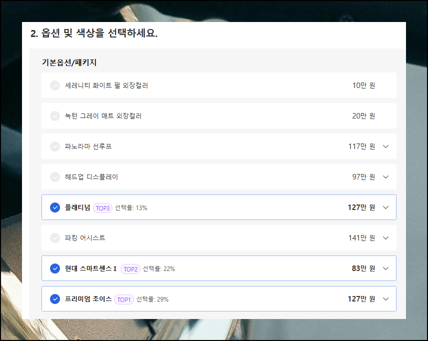 "견적내기" 버튼을 누르면 세부모델과 옵션별 금액을 확인할 수 있어요. 원하는 현대자동차 제품과 기능을 선택하면 오른쪽 가격에 자동 반영됩니다. 최첨단 안전장치, 네비게이션, 전방 센서 등 인기 옵션을 살펴보며 필수적인 것이 무엇인지 고민해보세요.