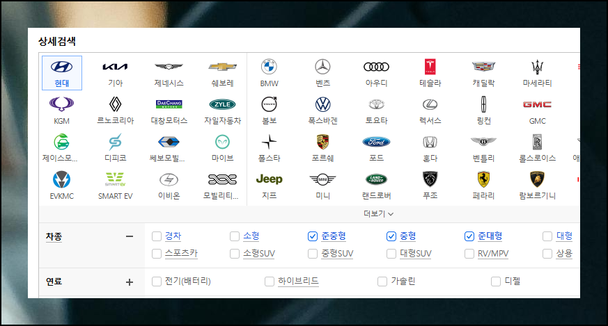모든 차종을 살펴볼 필요 없이 원하는 구동방식, 연료 유형, 주행 보조 기능 등 필요한 조건만 지정하세요. 준중형, 중형, 준대형과 같이 인기 있는 현대자동차 모델만 체크하면 필요한 자료만 확인할 수 있어요.