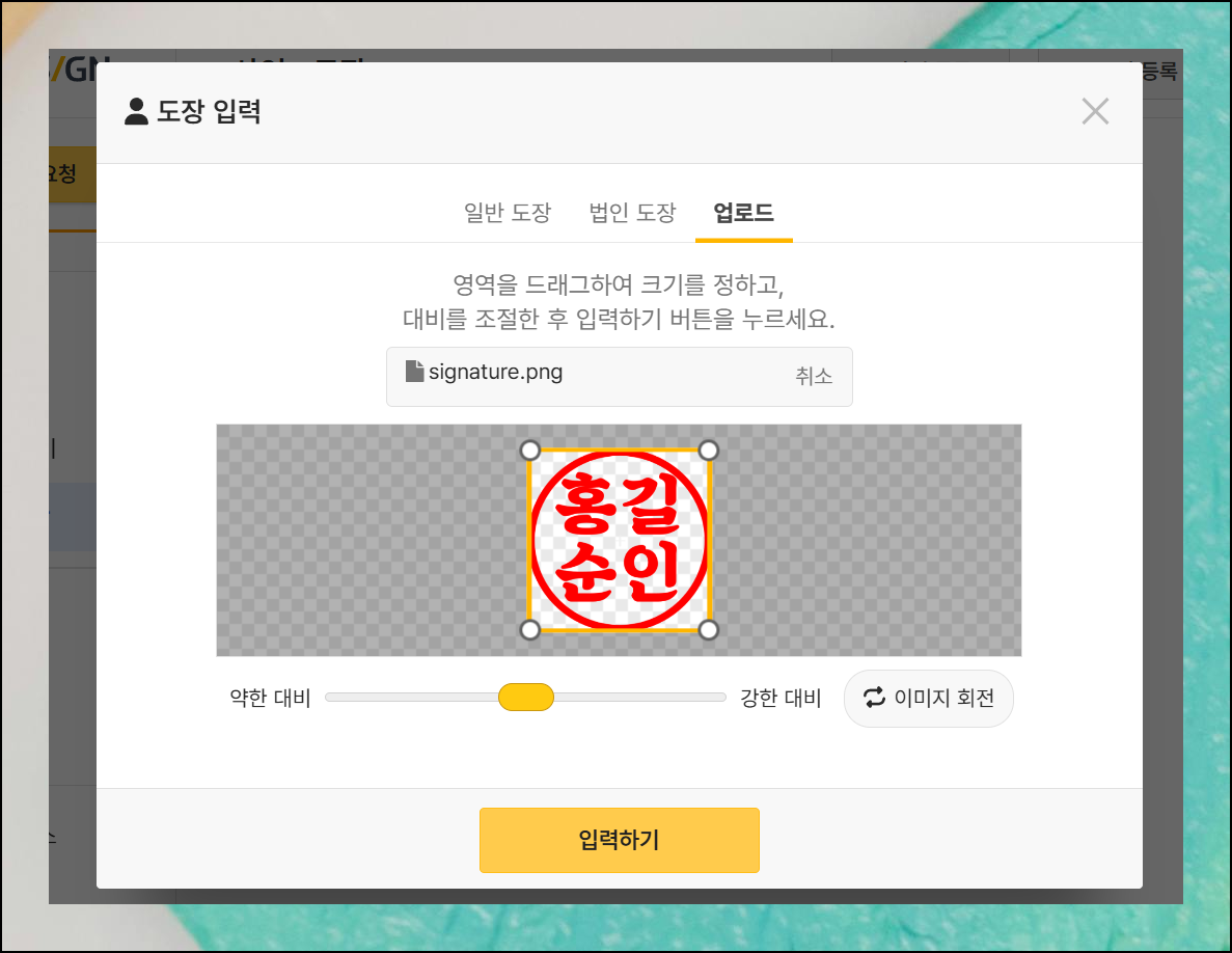 업로드 메뉴에서 [파일 업로드] 버튼을 눌러 스캔한 도장 파일을 올려주세요. 업로드가 완료되면 화면에 이미지가 나타납니다. 대비 조절 옵션이 제공되지만, 시스템이 자동으로 배경이 투명해지도록 세팅해줍니다. 스캔한 인감의 선명도가 자동으로 최적화되니 걱정하지 마세요.