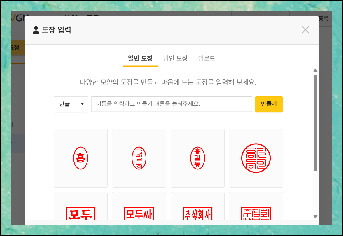 새 창이 열리면 도장 관련 기능들이 표시됩니다. 일반 인감이나 법인용 인감을 직접 생성할 수도 있지만, 우리는 기존 스캔 이미지를 활용할 것이니 [업로드] 메뉴를 클릭하세요. 이 기능으로 스캔한 인감 이미지를 시스템에 등록하고 배경을 투명하게 변환할 수 있어요.