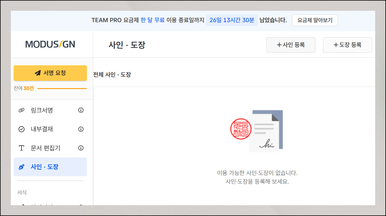 로그인 후에는 사인 및 도장 만들기 페이지가 나타납니다. 이 화면에서 [도장 등록] 버튼을 선택하세요. 이 기능을 통해 인감 관련 옵션에 접근할 수 있어요. 스캔한 파일을 업로드할 준비를 해주세요.