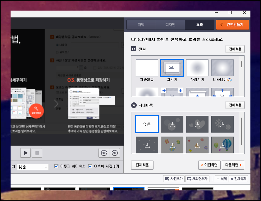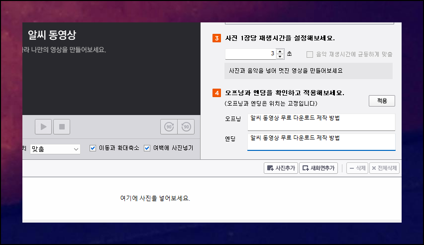 간편 만들기 창에서는 배경음악을 추가하고 사진별 재생시간을 조절할 수 있어요. 음악은 작품의 분위기를 좌우하는 중요한 요소니 신중하게 선택하세요.