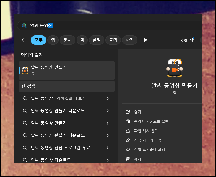 다운로드 받은 프로그램을 열기 위해서는 제가 알려드리는 방식을 사용하는 것이 좋습니다. 윈도우 시작 버튼을 누른 후 "알씨 동영상 만들기"를 입력해 보세요.