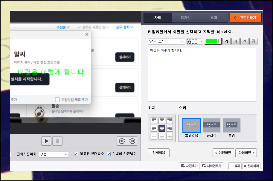 글자의 스타일, 크기, 색상도 자유롭게 변경할 수 있어요. 알씨로 만든 작품에 프로페셔널한 느낌을 더하고 싶다면 자막 기능이 큰 도움이 될 거예요.